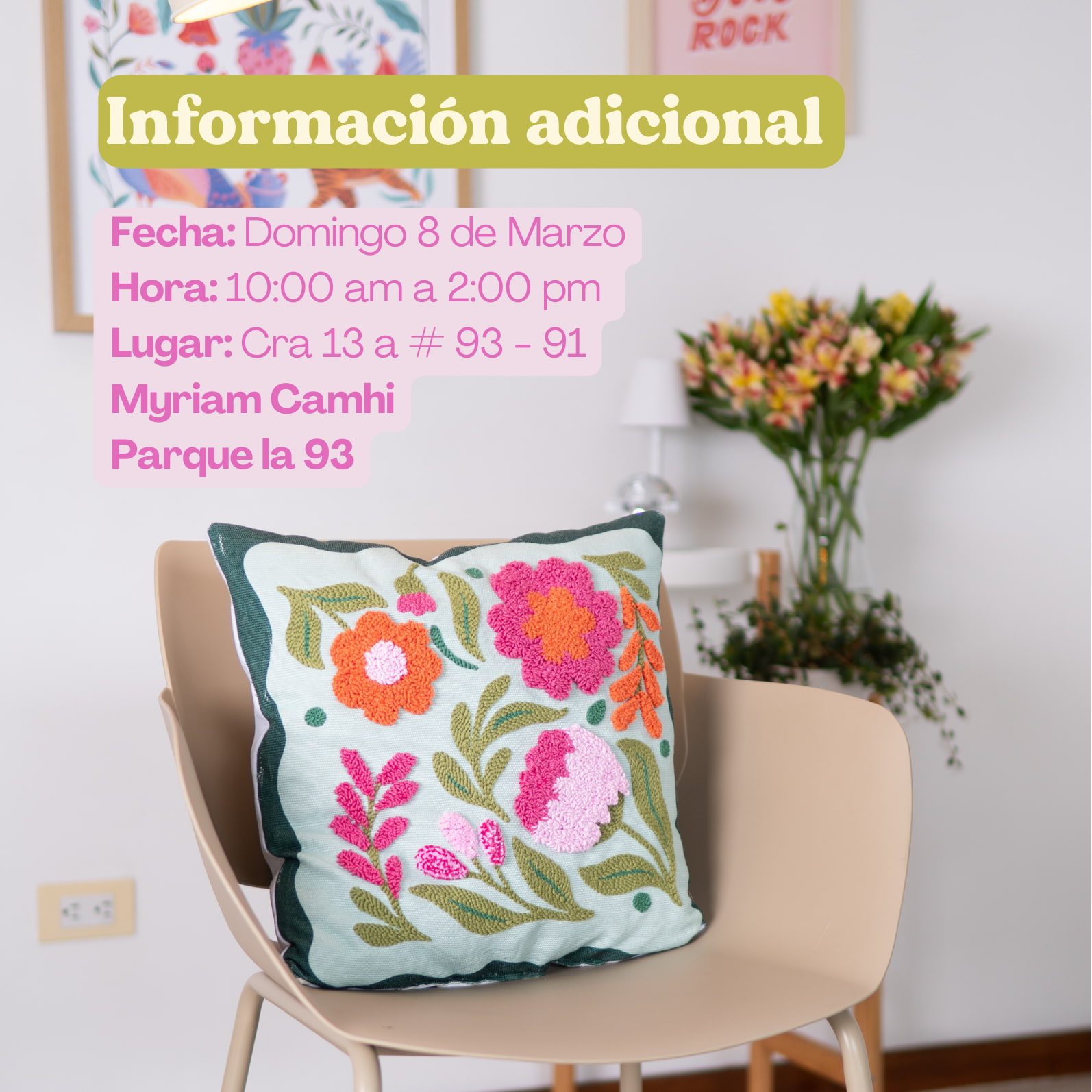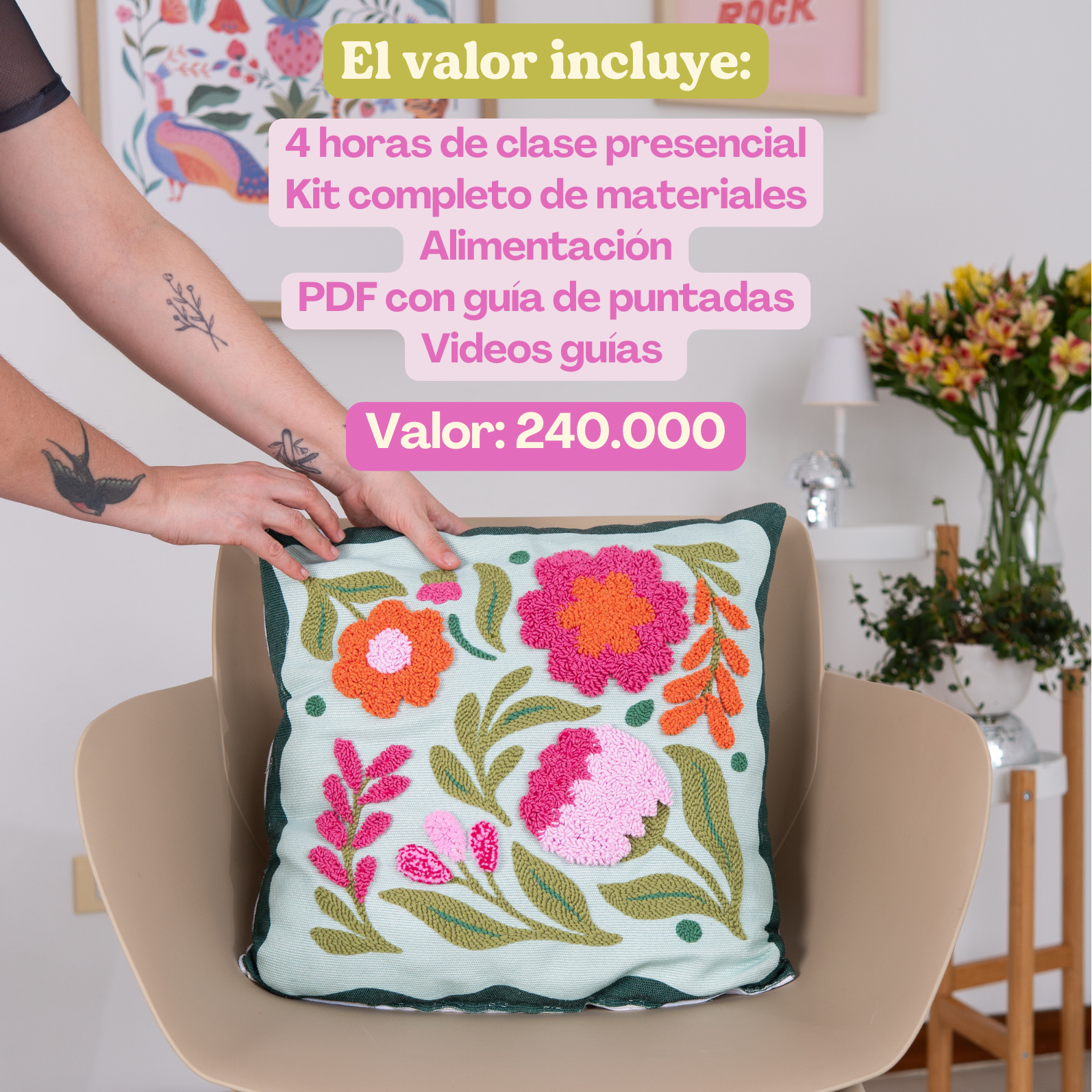 El proyecto que realizaremos en el taller será una funda para cojín, donde pondrás en práctica todo lo aprendido y te llevarás a casa una pieza hermosa hecha por ti.